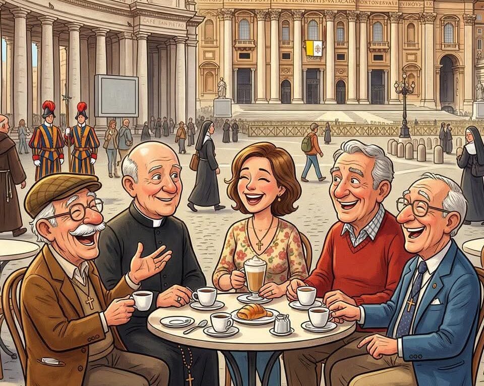 Four Catholic men and a Catholic woman were having coffee in St. Peter’s Square. The first Catholic man tells his