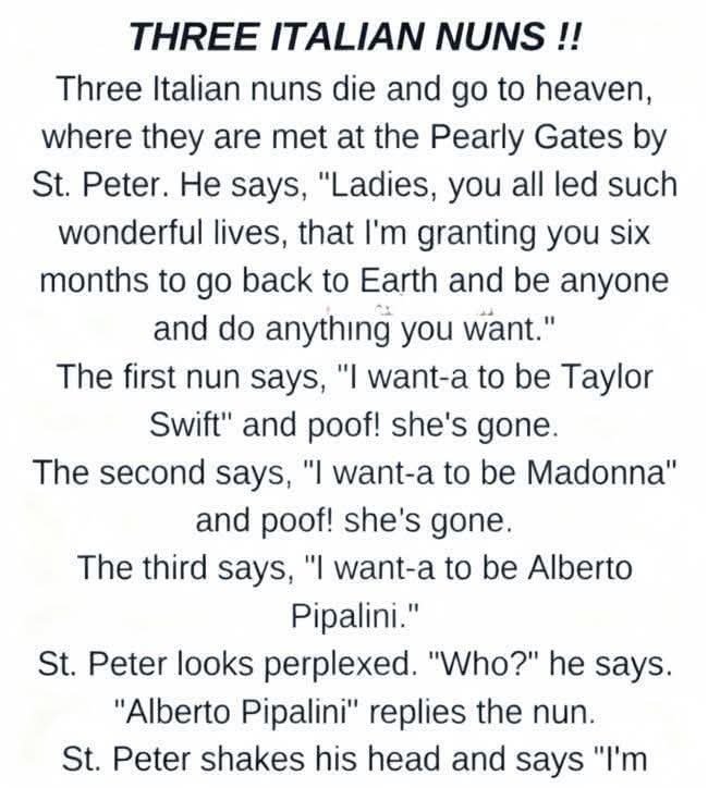 “I want-a to be Alberto Pipalini,” the third nun said softly. St. Peter blinked. He flipped through his records, checked a few heavenly databases, and scratched his head. “I’m sorry, sister,” he said gently, “but I don’t recognize that name. Is he a singer? An artist? A world leader?” The nun smiled wider and calmly pulled out a small newspaper clipping she had somehow brought with her. She pointed to a headline that read: ‘Local Man Alberto Pipalini Named Happiest Person Alive.’ The article explained that Alberto was known not for fame or fortune, but for living a simple, joyful life—running a small family business, laughing often, helping neighbors, and never taking things too seriously.
