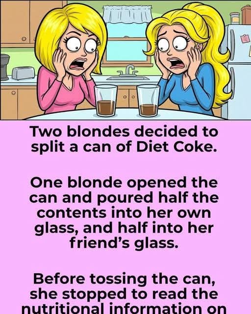 One blonde opened the can and poured half the contents into her own glass, and half into her friend’s glass.