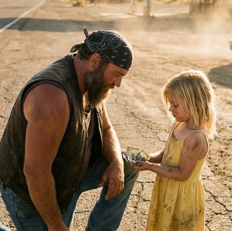 He was halfway through his third cigarette when the sound registered over the drone of passing eighteen-wheelers—a fragile, rhythmic whispering that lacked the frantic pitch of a child throwing a tantrum, carrying instead the desperate, terrifying concentration of someone trying to hold back the ocean with a teacup. Drawn by an inexplicable tug in his chest, Bear walked around the corner of the brick building and found a little girl, perhaps five years old, sitting cross-legged on the oil-stained pavement. Her blonde hair was a tangled, unwashed mess tied into a lopsided knot, and her faded floral sundress hung off her emaciated frame like a flag of surrender. Spread out before her on the blistering asphalt was an agonizingly meticulous arrangement of money. There were crumpled, tear-stained dollar bills smoothed flat with trembling, dirt-smudged fingers, alongside quarters stacked into precarious silver towers, and dimes pushed into perfectly straight rows.
