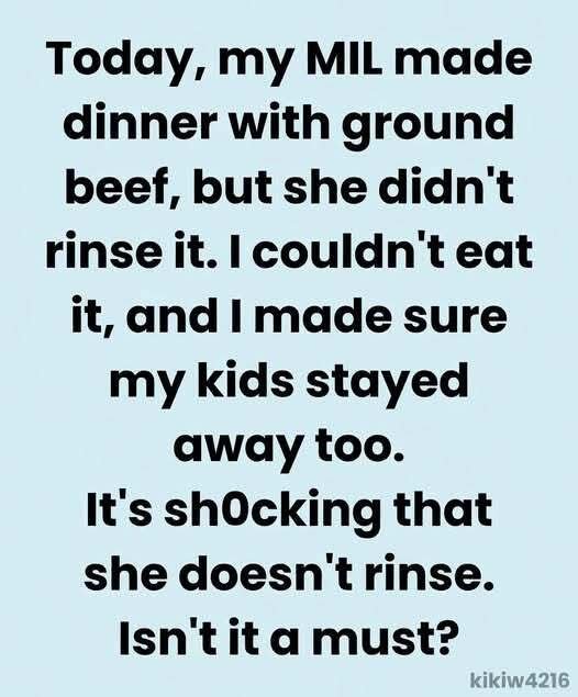 The text from my mother-in-law arrived while I was folding laundry, offering to cook dinner for the whole family that evening since she was visiting for the weekend. I replied with a polite thank you, secretly relieved because the kids had been picky lately and her cooking usually kept them happy. When we sat down to eat, the aroma of ground beef sizzling with spices filled the kitchen, but as I took my first bite something felt off. The meat tasted strangely metallic and gritty. I discreetly asked my husband what he thought and his face confirmed it. Later in the kitchen I discovered she had simply dumped the ground beef straight from the package into the pan without rinsing it under cold water first. Shock turned quickly to concern for my children’s health because I had always been taught that rinsing raw ground beef removes excess blood, bone fragments, and potential bacteria before cooking. I quietly told the kids they could have cereal or yogurt instead and made sure none of them touched the dish. My mother-in-law noticed immediately and asked why the children weren’t eating. When I explained gently that I preferred they avoid unrinsed meat she looked genuinely hurt and defensive, insisting that no one in her family had ever rinsed ground beef and that I was overreacting. The atmosphere grew tense as I stood firm, explaining my food safety concerns without raising my voice. That single decision not to let my kids eat the meal set off a chain reaction of emotions and conversations that would force our entire family to confront deeper issues around respect, different generational cooking habits, and the boundaries every parent must set even when it risks offending loved ones.