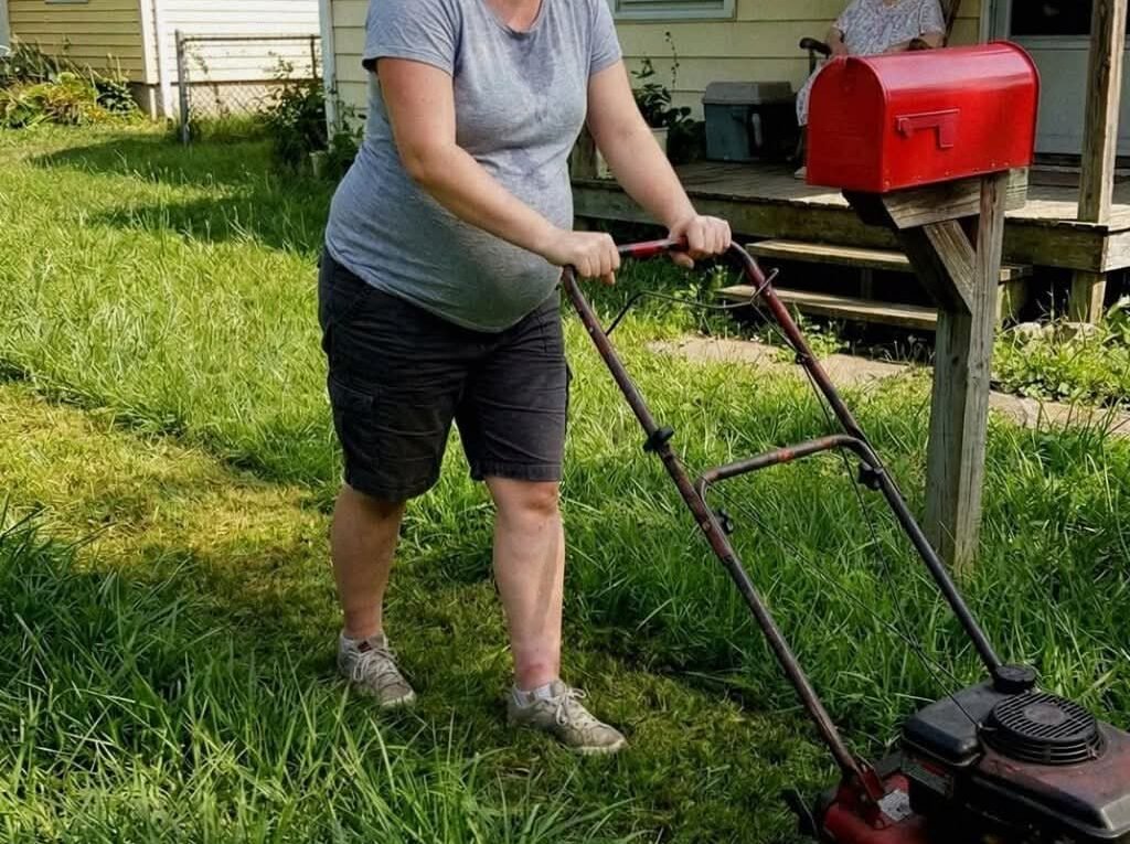 Eighty-two years old, standing behind a rusted mower, trying to cut grass that had grown far too high for her strength. She smiled when she noticed me, but it didn’t reach her eyes.